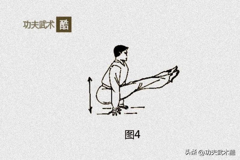 上身直立,双腿挺膝直腿,并靠坐于地上。然后双手十指扣地,手指挺直(掌心悬空),挺时直臂向上撑力,使上体及双腿悬空。然后做上下屈臂撑臂练习。每组5-10次(图4)。