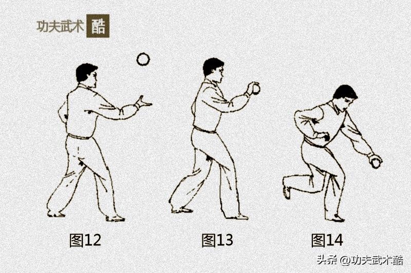 一手持握一铁珠(重量先为1-2千克,以后可逐渐增加重量,每次加0.5千克),向上直线抛出,待铁球下落至头部时,手掌反臂翻转,成鹰爪状,屈臂略收后,又向前抓接住铁球(图12、图13)。