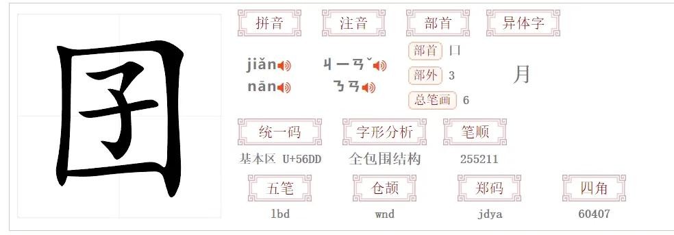 正确读法应该是:囡(nān)囝(jiǎn)。"囡"念第一声"nān",同"南";"囝"念第三声"jiǎn"。而囝读nān时表示小孩儿也指幼小的动物