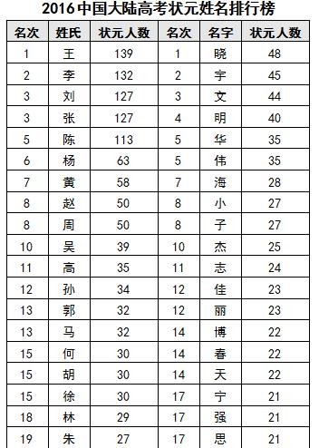 中国大陆高考状元名字使用次数最多的字是“晓”,有48人,雄居艾瑞深中国校友会网2016中国大陆高考状元名字排行榜100强榜首。