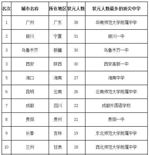值得关注的是,除4个直辖市,广州、银川、乌鲁木齐等培养状元人数最多,名列2016中国最盛产高考状元城市排行榜前3强。