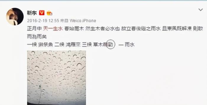 2016年2月,靳东在社交平台发文,却错将“草木萌动”中的“动”写成了“劝”;