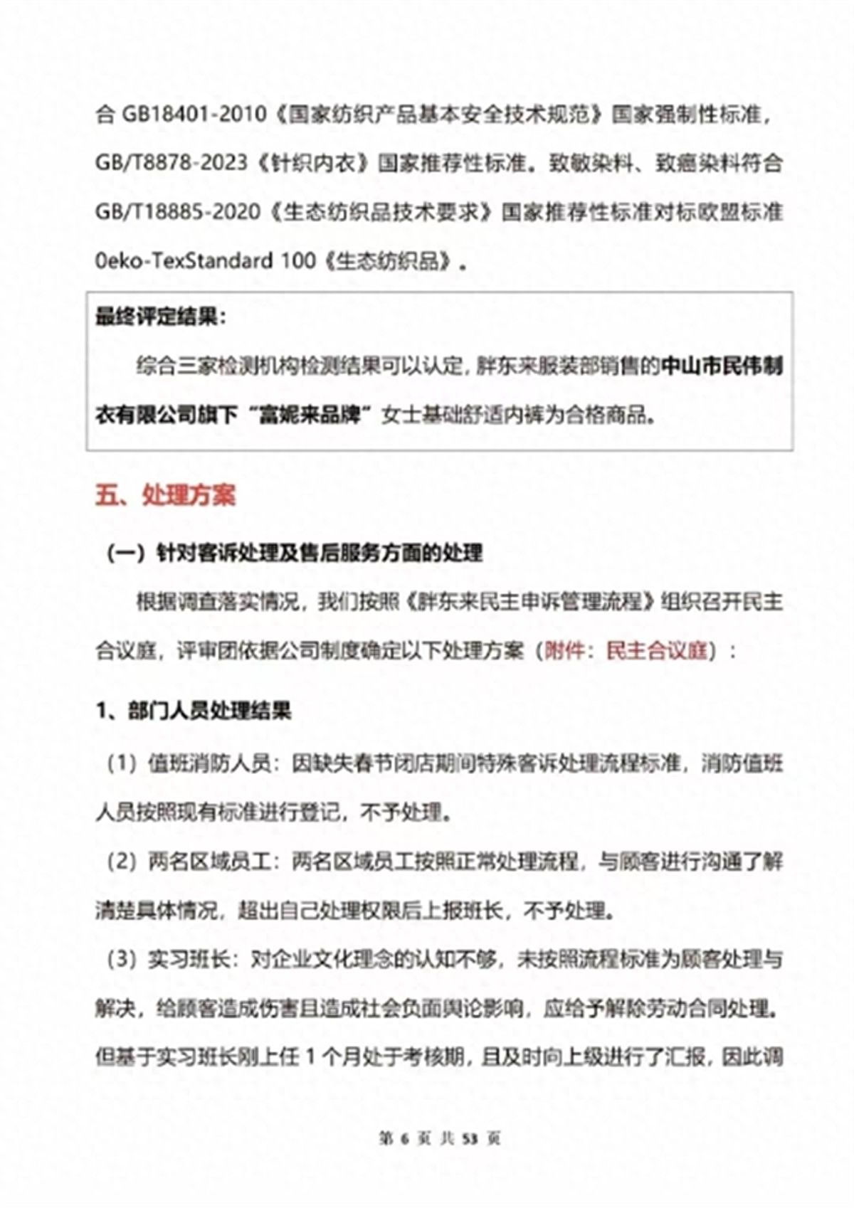 之后胖东来更是公开了一份长达53页的检测报告,报告中显示内裤的质量合格,并且针对这件事也有了后续处理。