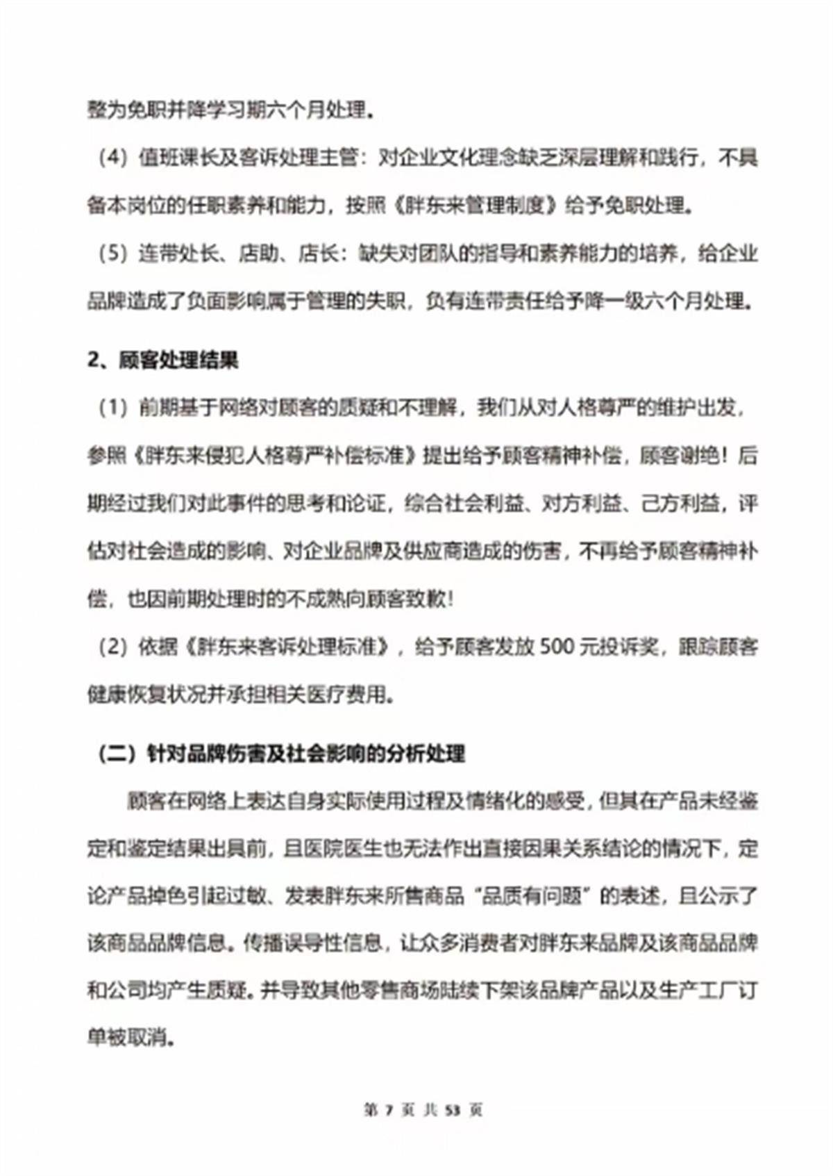 其中就有多名胖东来的工作人员受到了处理,其中就有实习班长和多名处长店长被降职,更是有值班课长及客诉处理主管被给予了免职处理,在声明中显示,胖东来表示将会给予顾客发放500元的投诉将并承担相关的医疗费用。