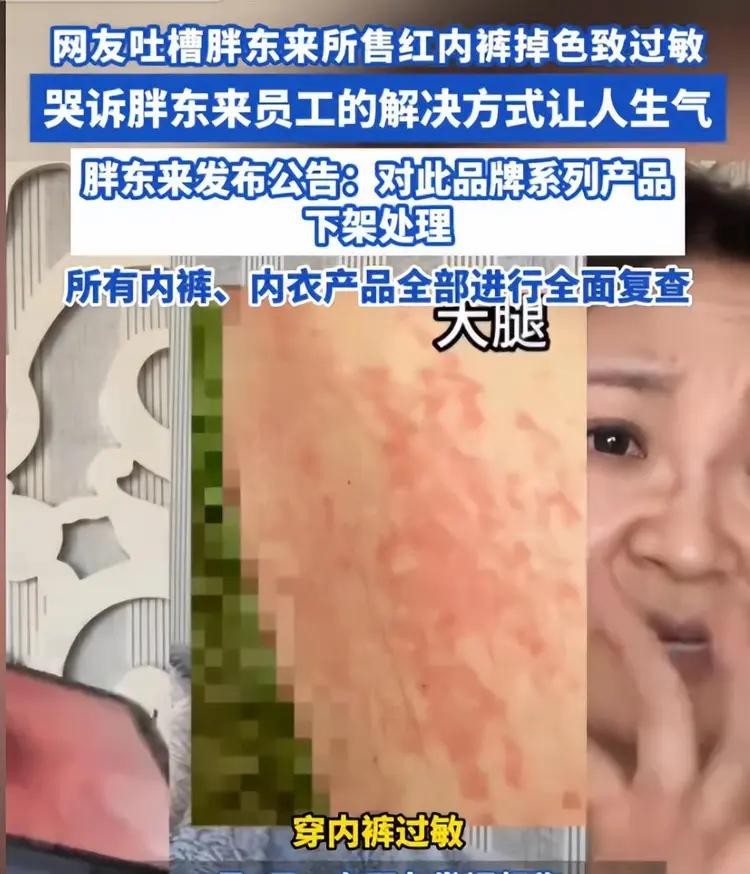 于是她在社交媒体上发布了一段视频,详细记录了内裤掉色的情形,并公开指责胖东来产品质量不合格,甚至引发了过敏问题。