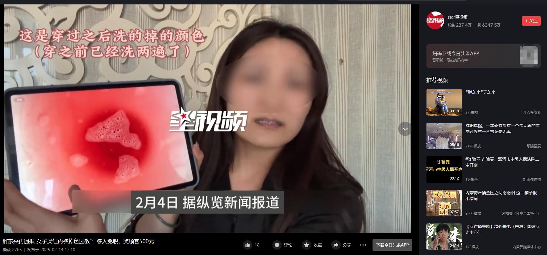 star星视频 2025-02-14——《胖东来再通报“女子买红内裤掉色过敏”:多人免职,奖顾客500元》