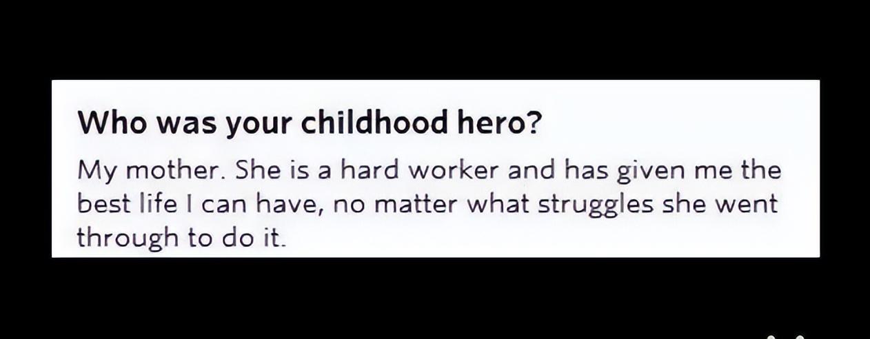 答:我的母亲。她努力工作才让我获得了我能拥有的最好的生活,不管是怎样的困难与挣扎她都坦然面对。