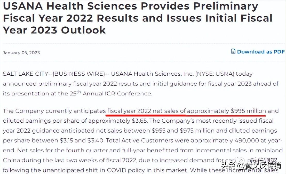 业绩欠佳之下,USANA对2022年全年的销售收入预估下降到了10亿美元以下,对2023年的预期更是只有8.5-9.5亿美元