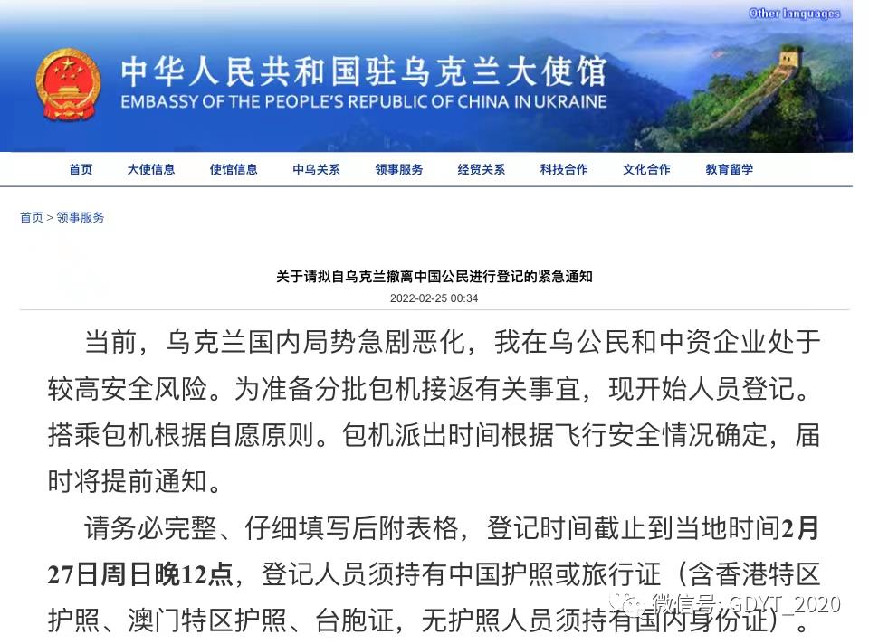 中国驻乌大使馆实时公布撤侨部署 (图源@中华人民共和国驻乌克兰大使馆)