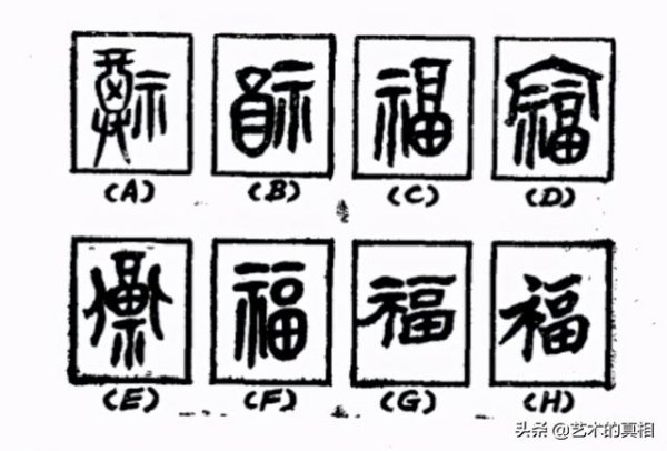 福,会意兼形声字。从河南殷圩出土的甲骨文(图A)来看,“福”是双手虔诚地捧着酒坛(酉)敬神(示)的形象,是用“手”、“酒”、“示”三个部分组合成的会意字,原是以酒敬神,祈求福备(万事顺遂)的意思。从上列甲骨文字形来看,它的左半部的上面是个“酉”字,是个盛酒的容器,实际上就是个“酒”字的初文。左下半部分是两只“手”(又),表示双手捧着一个酒樽;它的右半部分是个“示”字,代表祖先的神主;整个字的意思是会意双手捧着一樽酒在祖先的神主前祭献,求得神主保佑。《说文解字》在解释“福”字的意义时说“佑也”,“佑”就是赐福、保佑的意思。这个字发展到金文阶段,有种种不同的形式,首先是该字的左右结构换了个位置,“示”由右移到左,而“畐”由左移到右,同时金文比甲骨文还省去了捧酒的两只“手”。如图(B)的“福”,捧酒坛的双手已经省掉了,酒坛样子也变了;图(C)的酒坛子大大讹变,并且已放到“示”的右旁来了;图(D)在“酉”、“示”的上头还加上房顶屋盖,表示在家里敬神祈福;图(E)的讹变最大,“示”放到酒坛下面,两边平添了两个背对背的人(这背对背的人就是“北”字),作为“福”字表音的声符。到了秦代的小篆(图F)阶段,背对背的二人省去了,酒坛子竟讹变为“畐”(fù,读副),于是“福”便成为以“示”表意以“畐”表音的形声字了。以后便以这一小篆的构形作为基文,发展成为图(G)的汉隶和图(H)的楷书,而“畐”也作为“富、副、幅、辐……”等形声字的声旁,一直沿用到今天。