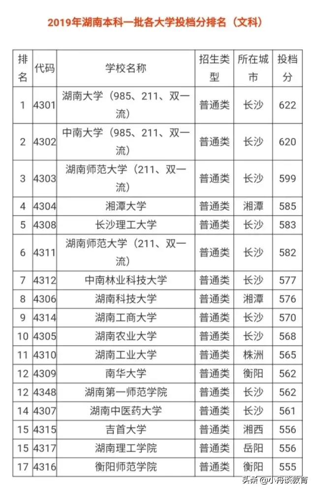注:湖南师范大学不同校区投档分不同,具体请参照第二列学校代码栏;同样学校不同排名,是因为以下表格按照投档分数线排名整理。