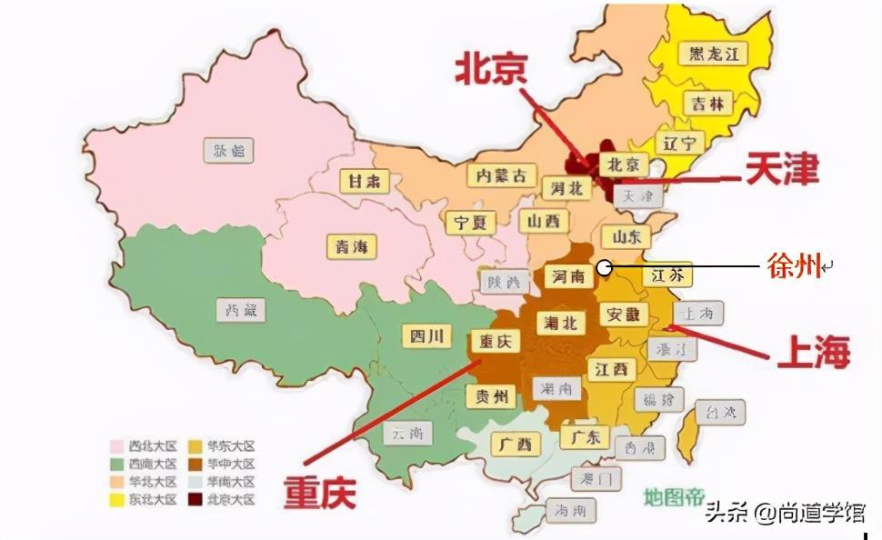 是否发现一个问题,四个直辖市之内有一片空白区域,我们可以发现,徐州正处在四大直辖市的中心位置。