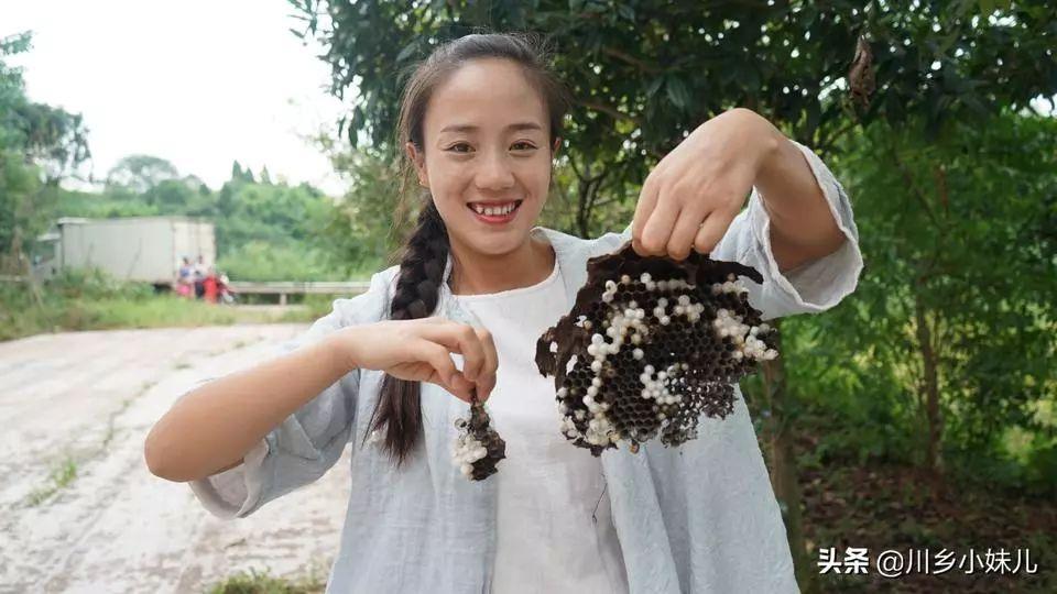 在马蜂窝刚被捅下来后,小妹儿就上手拿了一块拎回家,然后对着镜头说:“这个,大补,你们敢不敢吃?”
