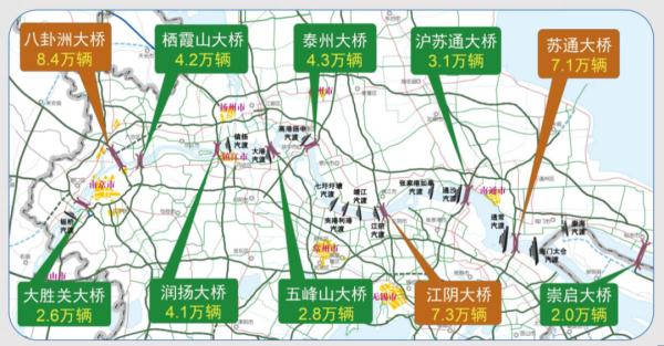 元旦期间,全省10座高速公路过江通道通行总体顺畅,预计日均过江流量约为46万辆/日。各过江通道流量分布基本均衡,八卦洲大桥、江阴大桥和苏通大桥三座过江通道流量仍然较高。
