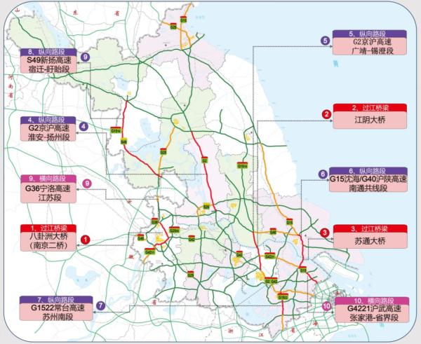 元旦期间,预计全省有10个路段在高峰时段车流量较大,可能出现阶段性车多缓行情况,主要为2个横向路段、3个过江通道和5个纵向路段。