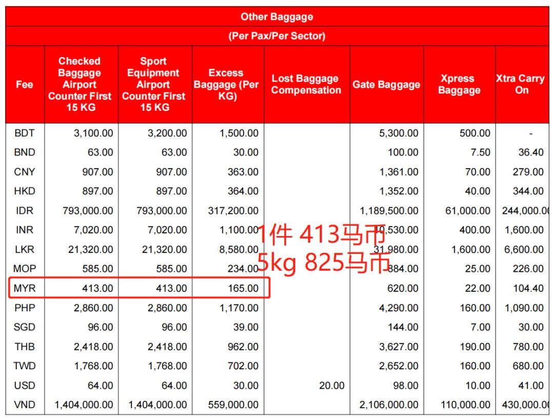 托运收费标准根据AK官方的收费标准,首件托运行李的收费为907元(15kg及以下),而超重则需支付363元/kg的费用,那么算下来是按20kg计算的话就是2722元(907+363*5),但是为什么视频中的收费是1807元?因为是飞吉隆坡的航班,工作人员可能是按马币(MYR)计算的费用?超重5kg是825马币+托运1件行李413马币。如果计算汇率是1:1.46的话,那么就是1204+602,就是视频中的1205+602=1807了。经过协商,工作人员应该是选择了相对划算的货币收费标准来降低收费。