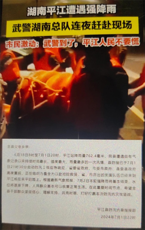 目前,湖南省气象台继续发布暴雨橙色预警,预计未来一周湖南仍处于雨水集中期,湘北、湘中有持续性暴雨到大暴雨,局地特大暴雨。平江县防汛抗旱指挥部呼吁全县人民众志成城应对特大洪水灾害,呼吁邻里之间相互帮助,共克时艰。