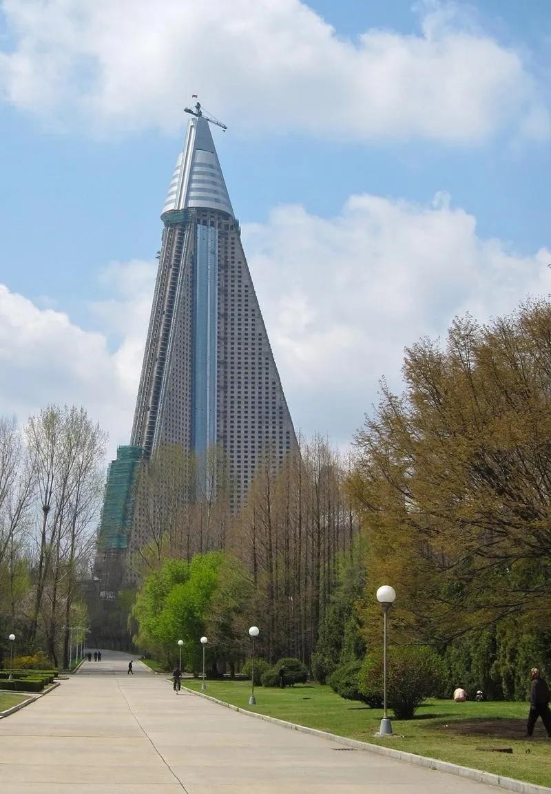 此后十几年,它如巨大混凝土空壳,起重机生锈留在顶部。由于朝鲜钢产量低,只能用混凝土建造,却又面临地基下陷问题。政府封锁饭店,甚至从地图上删除。