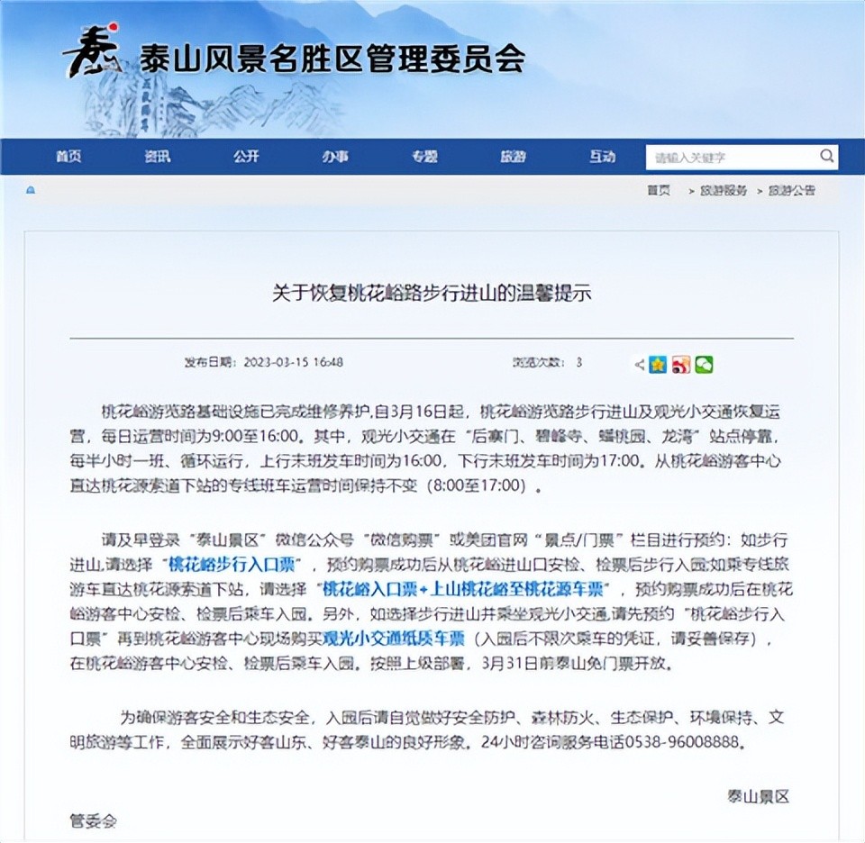 3月16日起,泰山桃花峪游览路步行进山及观光小交通恢复运营