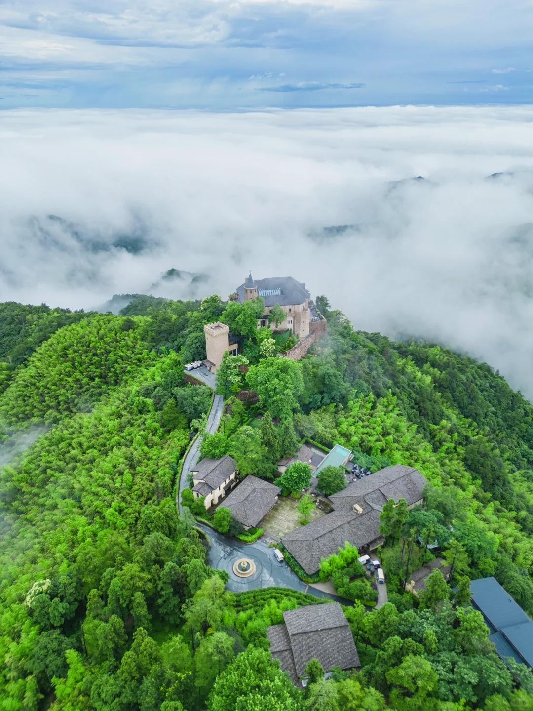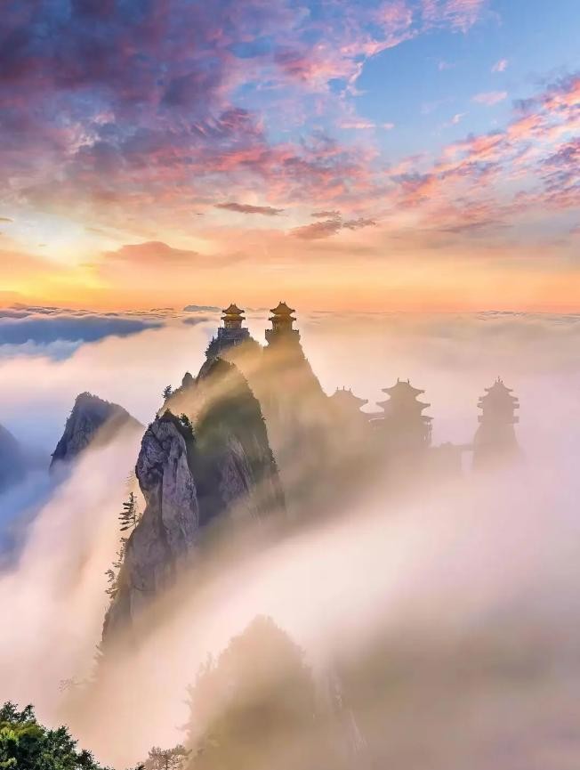 山顶的金顶道观群在云雾中若隐若现,彰显了深厚的道教底蕴。