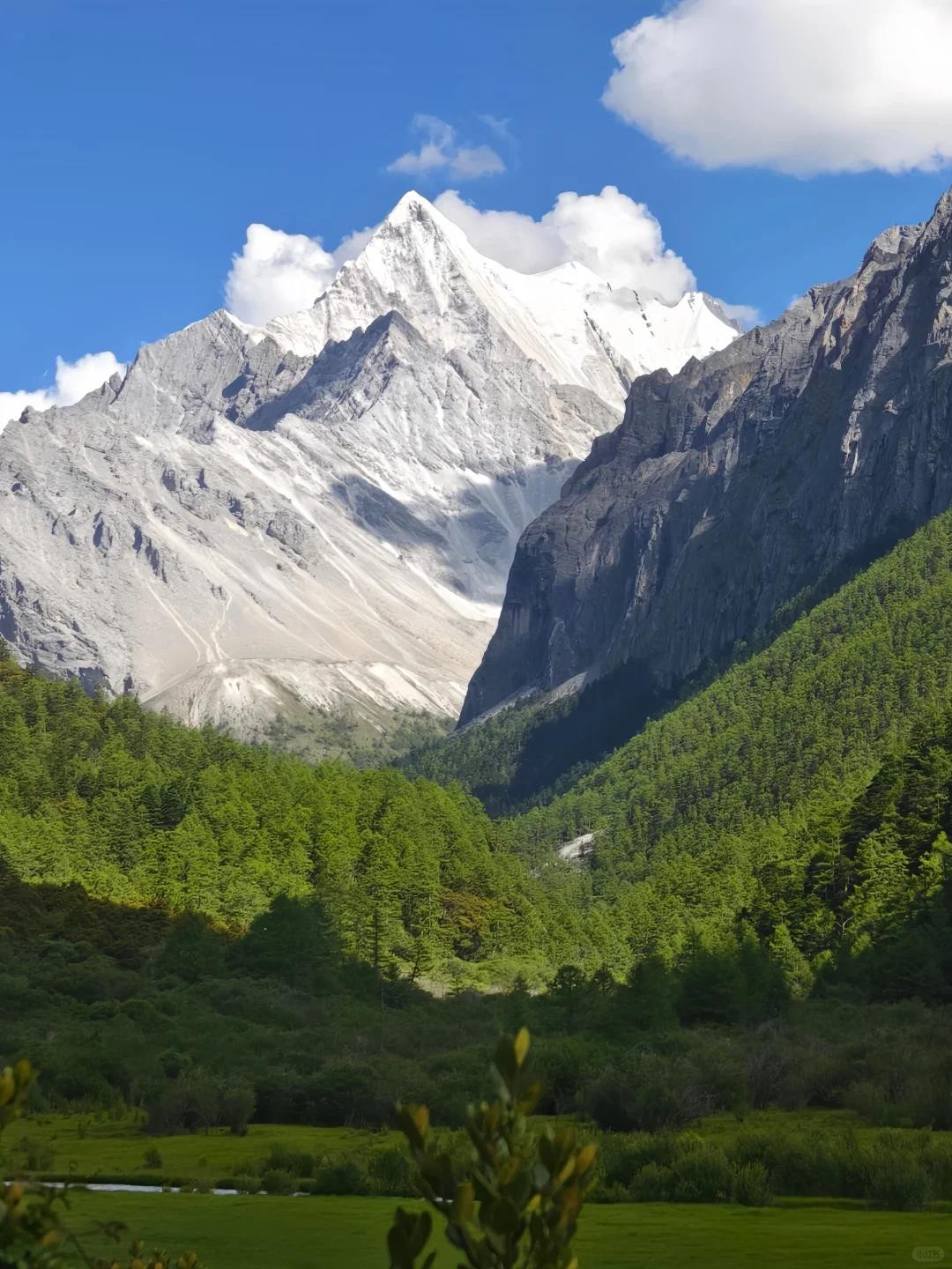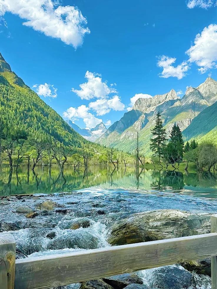 核心景区以三座神山为标志,周围环绕着清澈的河流、湖泊和广袤的高山草甸。