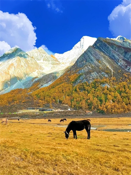 秋季时,层林尽染,与雪山相映生辉,是摄影与心灵之旅的绝佳去处。