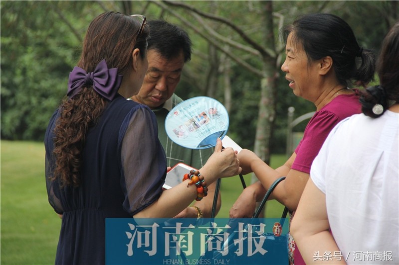 河南商报记者也发现,时不时的有人频繁在人群中来回穿梭,悄悄递上印有机构信息的名片和塑料扇子。他们用“广撒网”的方式,也积极做着“营销”。