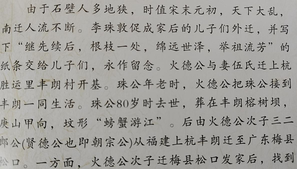 不辛,我,按上杭记载也是李火德后裔,上杭说我宗始祖纯笃德明李公是李火德七世孙,我们族谱以纯笃德明公为一世始祖是错的,应该加六世。也有一些不明事理的前代宗长,在上杭的蛊惑下,改了自己世系。悲哀之余,加大了我对族谱的兴趣。在业余闲之际,认真收集翻阅各地族谱资料,从中找到,上杭四处宣扬,广播四海的李火德之父——松口珠公,居然比李火德还小。我想笑,却笑不出来。如此谎言,号称几千万后裔的李火德子孙,居然没有人发现。还在抖音,网络等平台,努力帮忙宣扬。认错祖宗,还自为荣光!人家上杭还有【珠公遗墨】呢。什么,金木水火土田 德 六子各自留存“继先续后 根枝一处 绵延世泽 举祖流芳”。编得比真的还真!