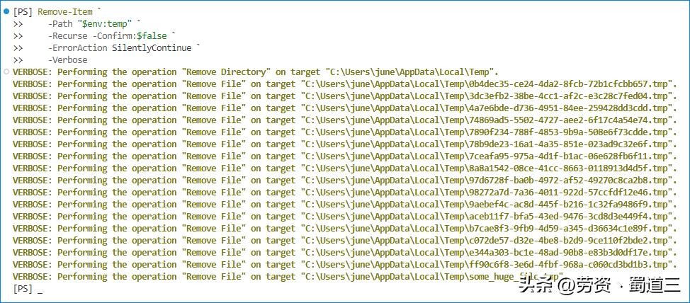 Remove-Item ` -Path "$env:temp*" ` -Recurse -Confirm:$false ` -ErrorAction SilentlyContinue ` -Verbose此 PowerShell 命令将递归删除用户临时文件夹中的所有文件和子目录,而不要求用户确认。如果在此过程中发生错误,该命令将静默执行,不会显示错误消息。但是,它将显示其删除的每个项目的详细消息。