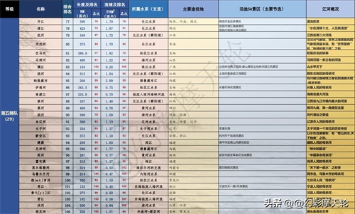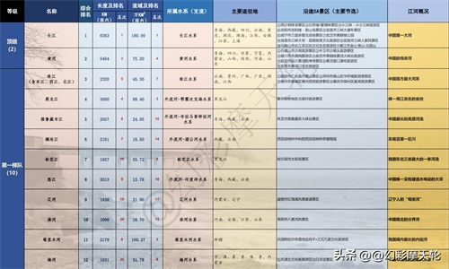 每条河流都有着自己独特的故事,而这份榜单通过对河流长度、流域面积、所属水系、流经省市、沿途孕育5A景区以及河流影响力6个方面进行综合评比,评出2个顶级河流、5个不同等级梯队,共计105条河流。