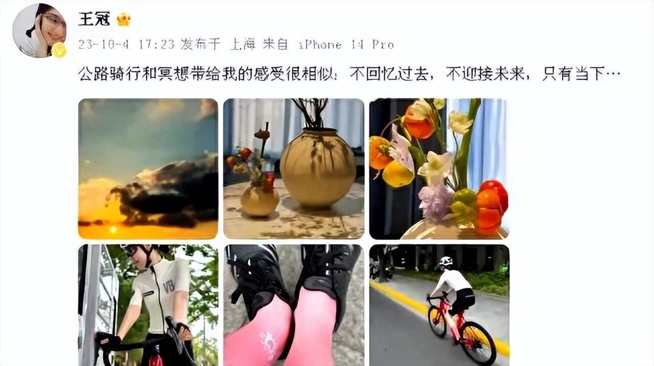 照片中的王冠宛如少女,肌肤胶原满满,让人忍不住为她的自律点赞。而那背后的一段文字更是引人深思:“公路骑行与冥想的感受,是那么相似,只有此刻,没有过去和未来...”。让人思考,那个曾经的舞台焦点,是否正在为了某些未知的变故进行冥想?