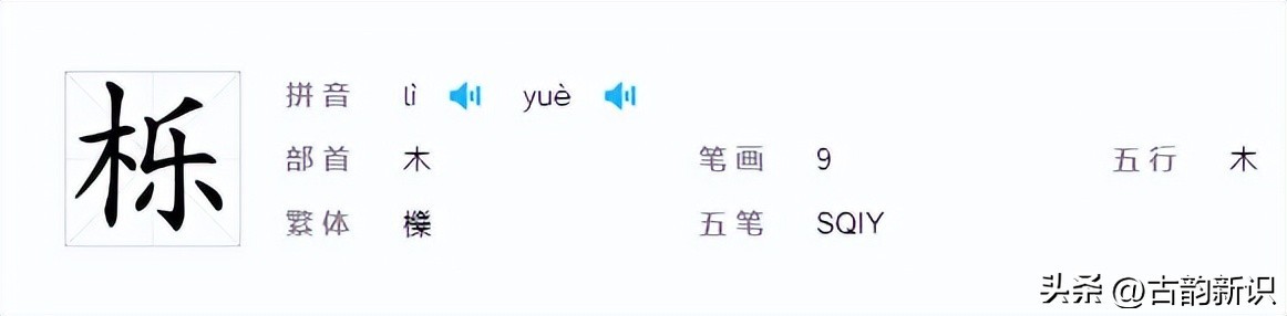 从上图中我们可以看到,“栎”字它的汉语拼音有两个读音,其中一个是读作【lì】,读第四声,音同“力”。另外一个是读作【yuè】,也是读第四声,音同“月”。左右结构,以“木”字为部首,总笔画是9笔。
