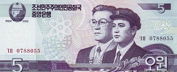 5朝鲜元的正面印有学生与科学家,或者可以解读为知识分子与博士。背面展示了位于黄海北道的礼成江青年1号水电站,这个水电站的建设旨在控制洪水,灌溉农田并发电,具有重要的农业和能源意义。