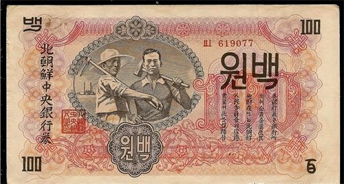 100朝鲜元的正面印有木兰花,这种花在1964年被金日成发现并视察,被尊为朝鲜国花。背面则简单显示了面值。
