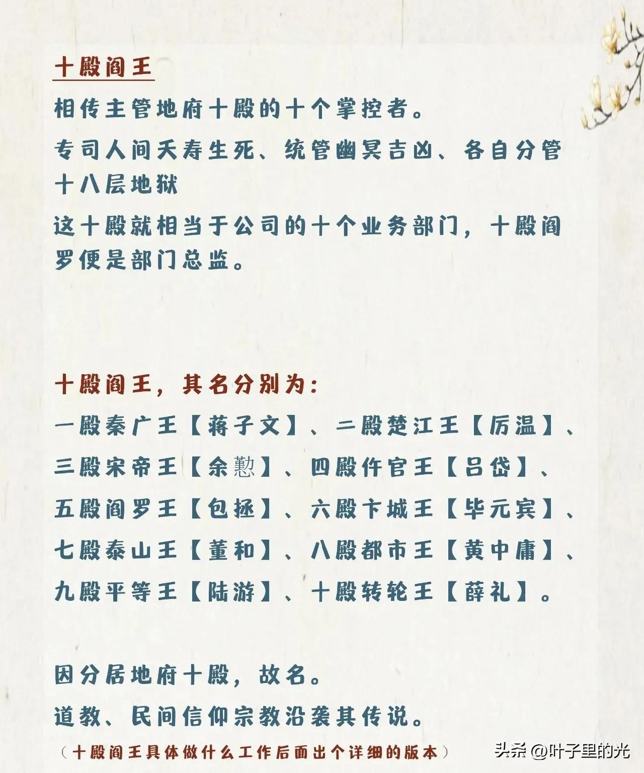 3、十殿阎王:主管地府十殿的十个掌控者。相当于公司的十个业务部门,十殿阎罗便是部门总监。