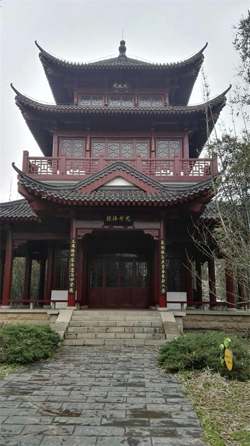 闻风阁属公园标志性建筑,阁名源于"闻风而兴,四面风铃常报喜"。楼高三层,门面三面,36根大柱立地而起,翘角二十层层凌空,角上悬挂铜铸风铃,黑色琉璃瓦古色古香。