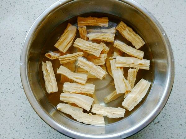 第一点:首先将一大根腐竹折成小段,放在40度的温水中泡发。有人直接用冷水泡发需要3到4小时,还有的人直接用热水泡发会导致腐竹外皮泡软里边还夹生。所以一定要40度的温水泡法既能节省时间而且腐竹还不会夹生。