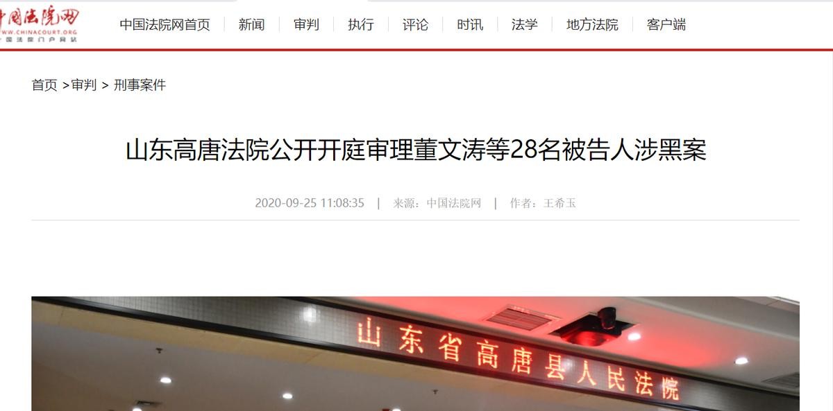 中国法院网《山东高唐法院公开开庭审理董文涛等28名被告人涉黑案》