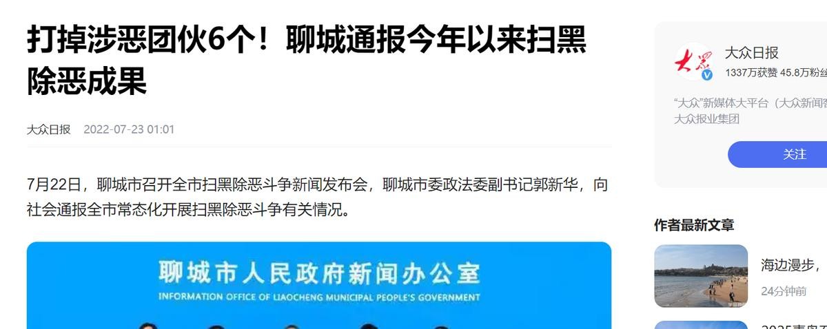 大众日报《打掉涉恶团伙6个!聊城通报今年以来扫黑除恶成果》
