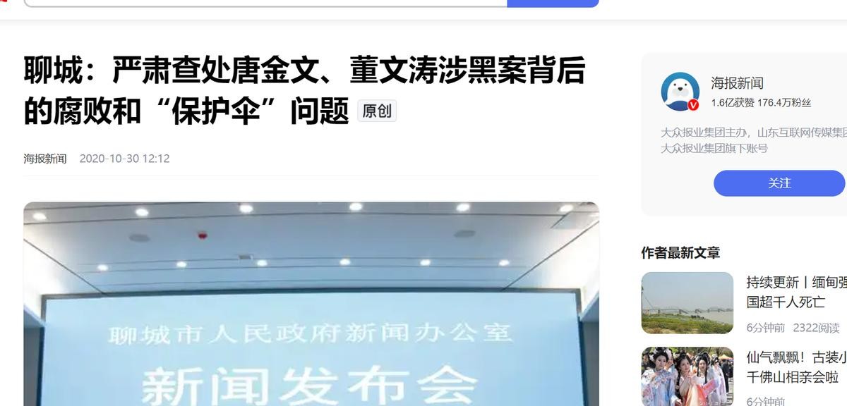 海报新闻《聊城:严肃查处唐金文、董文涛涉黑案背后的腐败和“保护伞”问题》