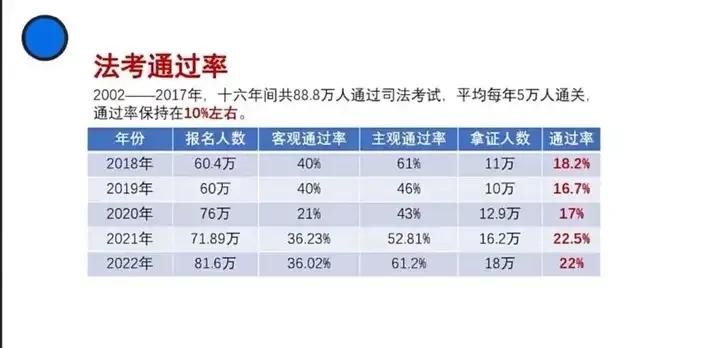 而从2018年-2022年这五年的通过率数据对比,2018年通过率达到18.2%,有11万人通关拿证,2022年通过率已达22%,拿证人数18万,这也显示法考的通过率确实有所提升。