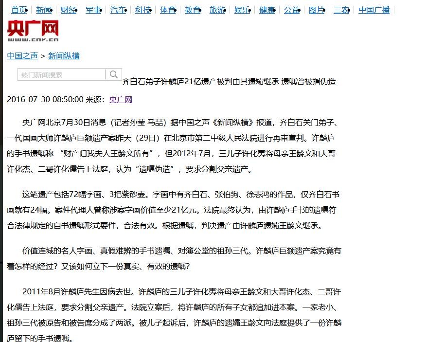 参考资料:齐白石弟子许麟庐21亿遗产被判由其遗孀继承 遗嘱曾被指伪造