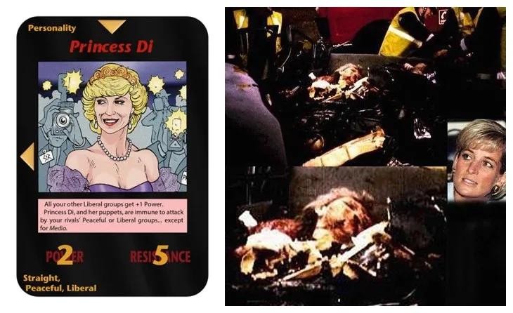 而这张卡牌有意思的地方不是他的图案,而是这张卡牌它的效果“戴安娜王妃免疫所有来自对手的攻击,除了媒体”,这便让人浮想联翩了,众所周知在1997年8月30号晚戴安娜王妃发生车祸,不幸去世了,而车祸的原因正是因为戴安娜王妃为了躲避狗仔,也就是躲避媒体,不得已命令司机加速行驶,结果撞到了灯柱和石墙上,当场身亡。这便有点令人毛骨悚然了。