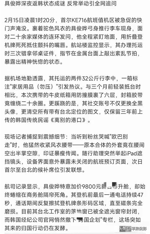 具俊晔用风衣领子遮住半张脸,手指下意识地摩挲着登机牌条形码区域,这个习惯动作曾在大S的直播中出现过,如今他的动作使得黑色磁条都变得斑驳。