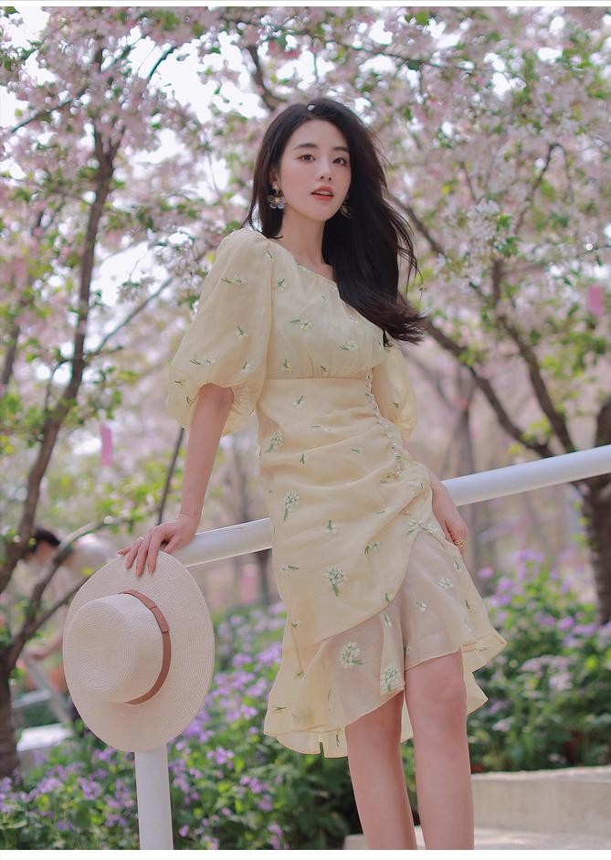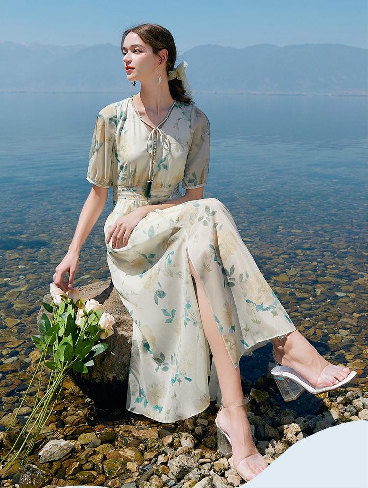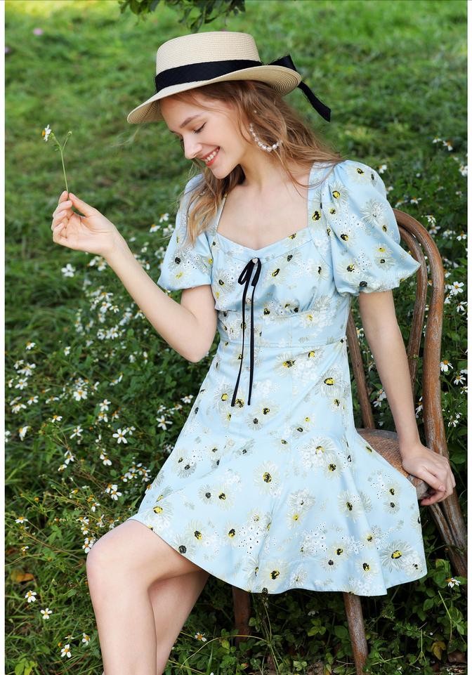 推荐:优雅鱼尾裙摆 碎花图案 泡泡袖 亲肤面料