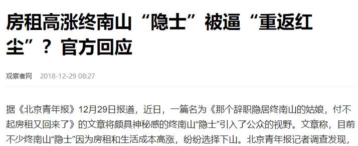 信息来源:观察者网2018-12-29发布的关于《房租高涨终南山“隐士”被逼“重返红尘”?官方回应》的报道;