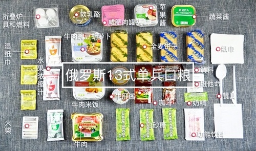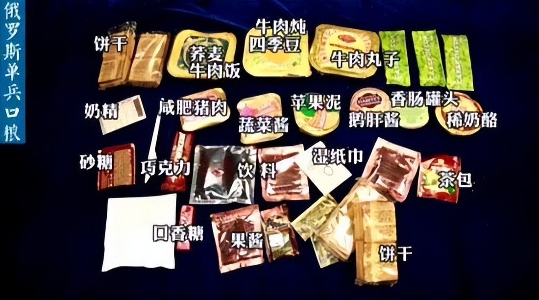 俄罗斯单兵口粮,是根据作战需求来划分的,徒步口粮、山地部队口粮、紧急口粮等,基础搭配就是肉菜罐头、饼干,另外加上奶酪、饮料茶等,D但无一例外同样都是高热量路线。