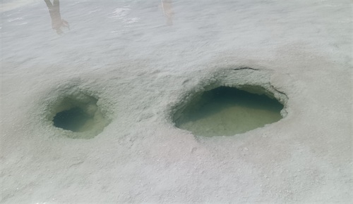 当我并不知道翡翠湖也是盐湖时,心想,一个连名字我都是第一次听说的湖,除了可能的山水和游人外,还会有什么动人之处?当我在一个个被盐道分割开的大小有别、深浅各异、颜色不同的盐湖间穿梭时,翡翠湖震撼了我。这竟是一处人工湖,原为化工厂的采矿区,资源开发后,卤化物成了湖水,而矿物质有的沉于湖底成了盐层,有的则散落湖边,成了盐道。盐道纵横,水面广布,就组成了翡翠湖。这里含盐量高,四季不冻,清澈见底,“静影沉壁”(范仲淹《岳阳楼记》)。湖水富含不同浓度的矿物质,所以呈不同的颜色,碧蓝、奶蓝、橄榄绿,色彩斑斓。漫步盐道,不时看见各种形状的盐池,最吸引人的是成双成对的那一种,像美人眼睛般顾盼流芳,但我宁愿把它看作通透的鼻孔。鼻子有恙的人士,看着它,赛过吃芥末,登时就有一种呼吸畅通的感觉。