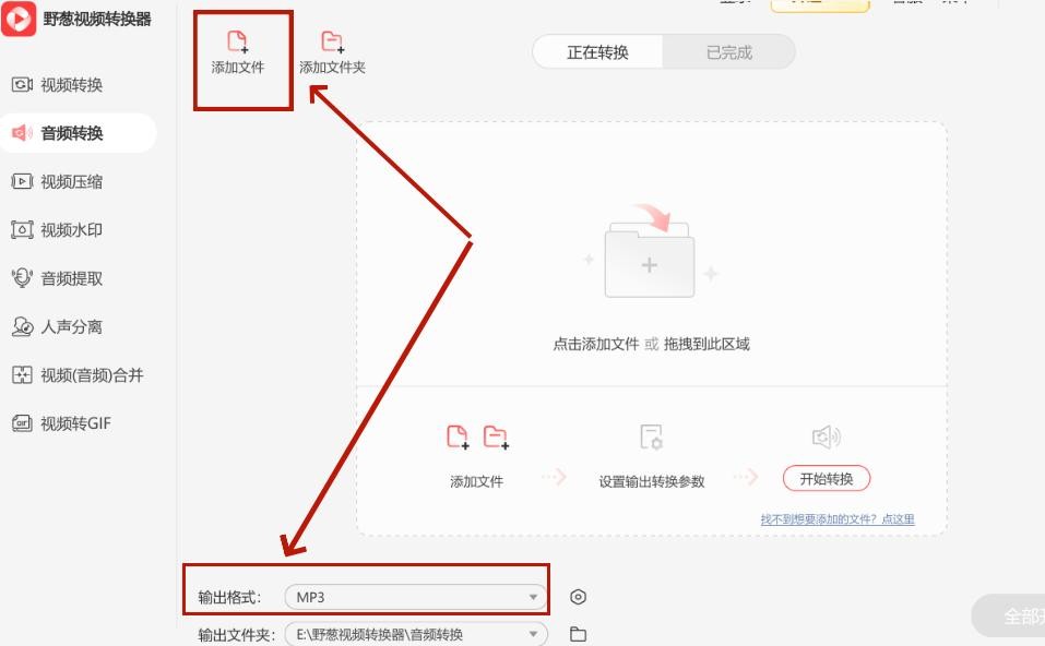 步骤2,选择“打开文件”,将音频上传到转换器中,把输出格式设置为“mp3”。