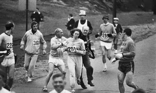 1967年,一个名叫Katherine Switzer的19岁女大学生也不甘性别歧视,用自己的姓名缩写“K.V. Switzer”进行了报名,竟然通过了……但是在赛道上她还是被发现了,甚至出现了阻拦她参赛的情况。但是在男友的帮助下她还是完成了比赛。
